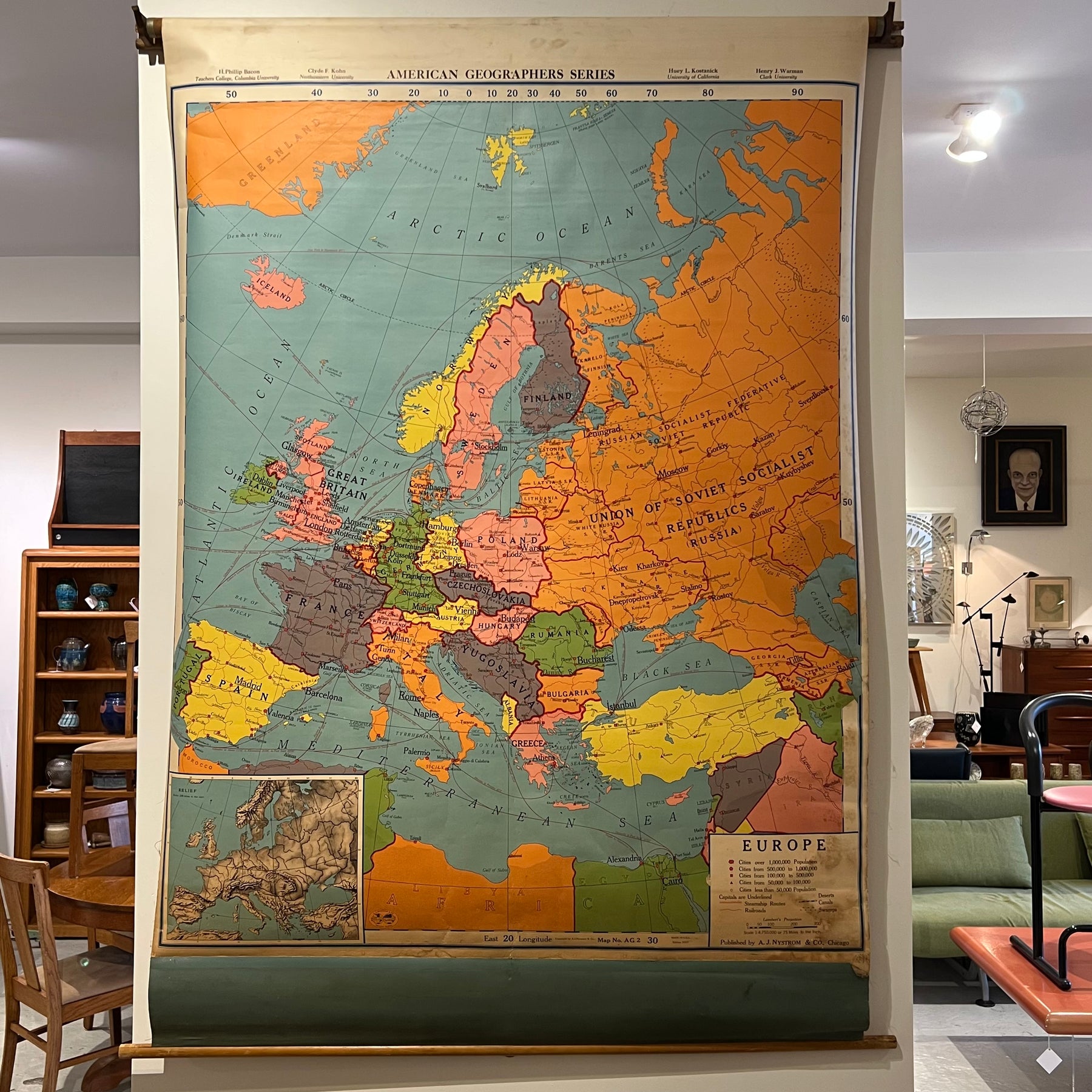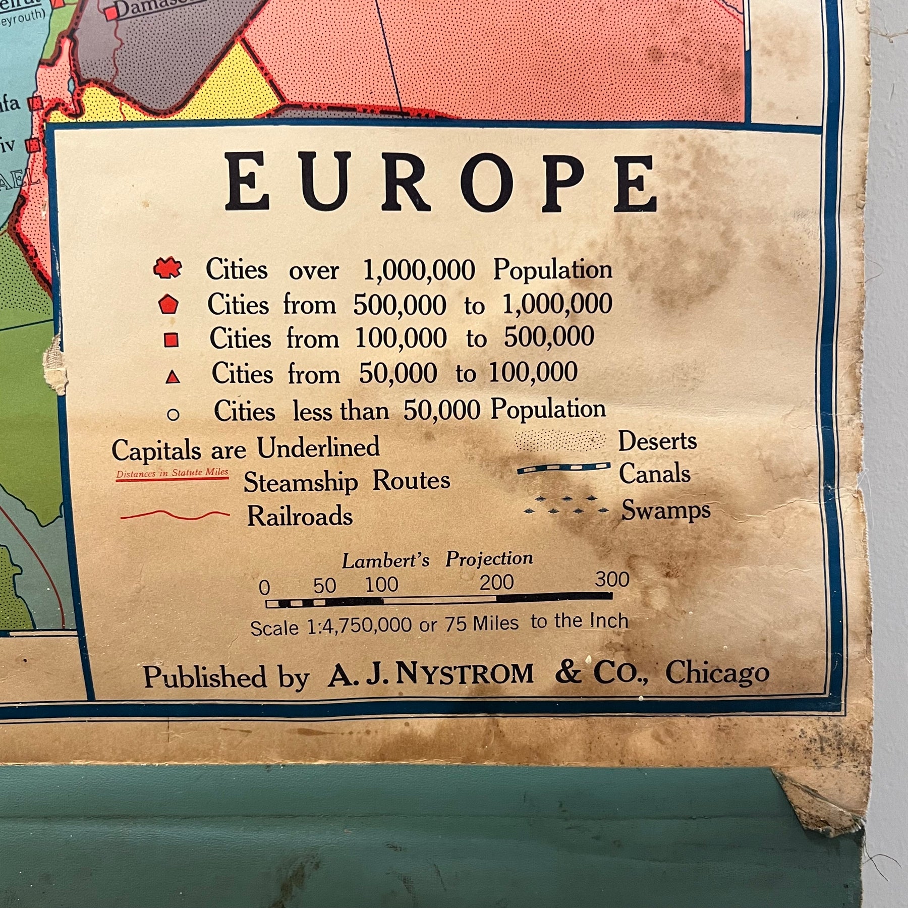 1957 AJ Nystrom pulldown map of Europe. Pulldown mechanism is in working order. Some minor stains burning otherwise good condition.