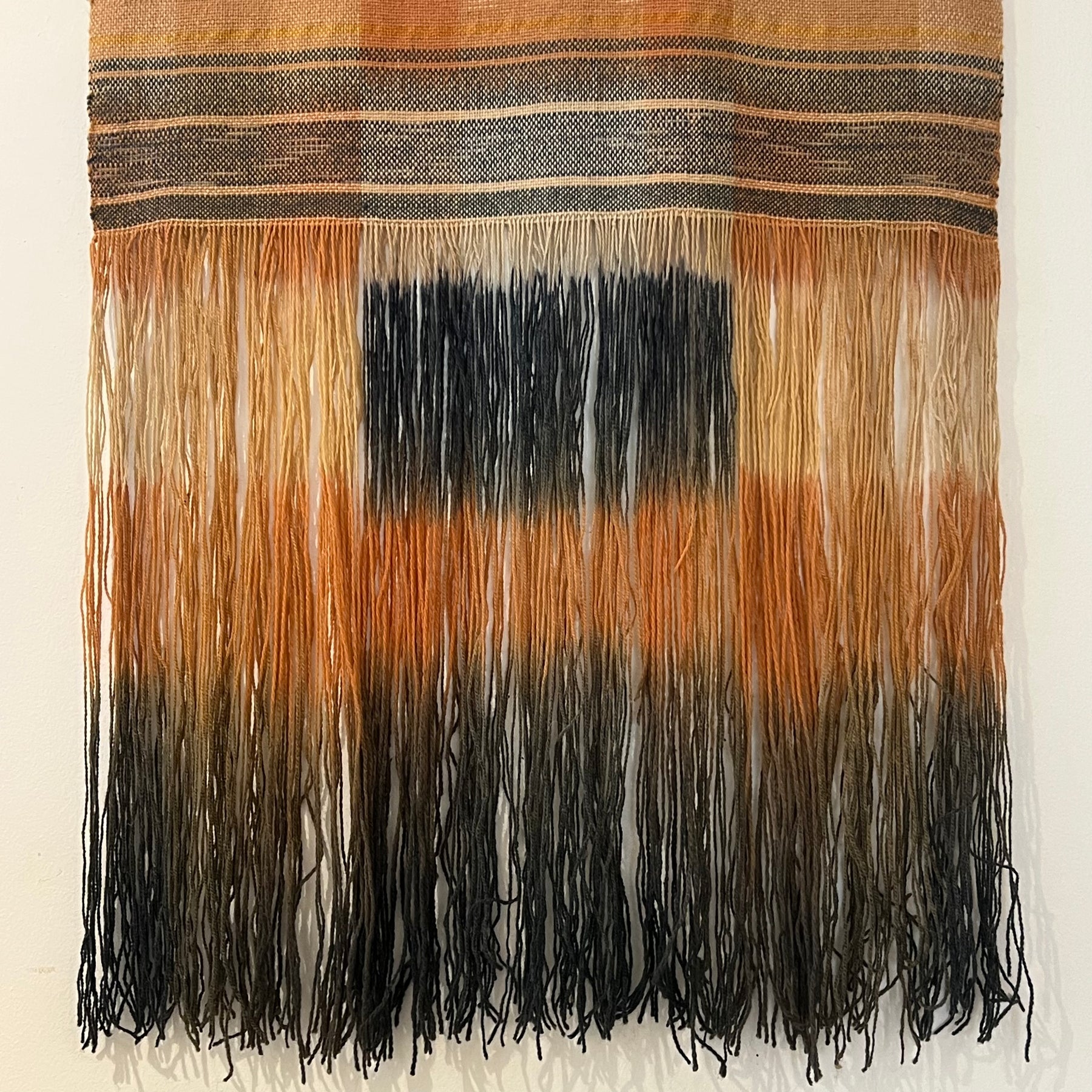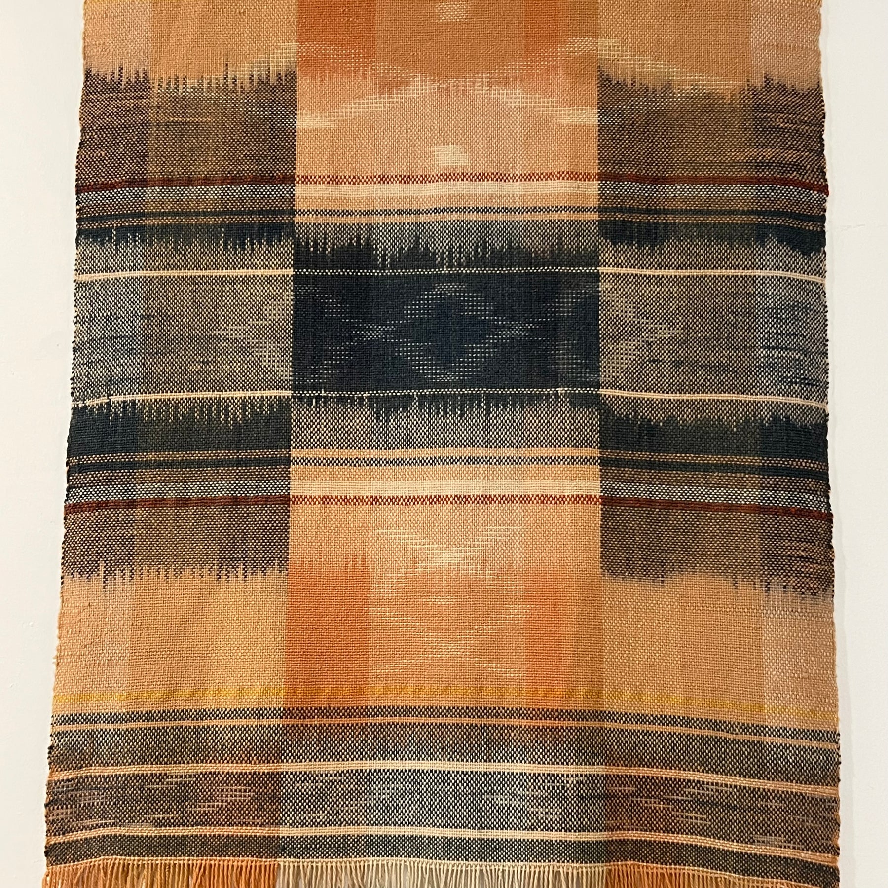 Gorgeous fine wool hand-woven Japanese tapestry from the late 1960s/early 1970s. Sublime combination of warm and cool hues and pattern variations, with a generous fringe at the bottom. Polished carved wood hanger.