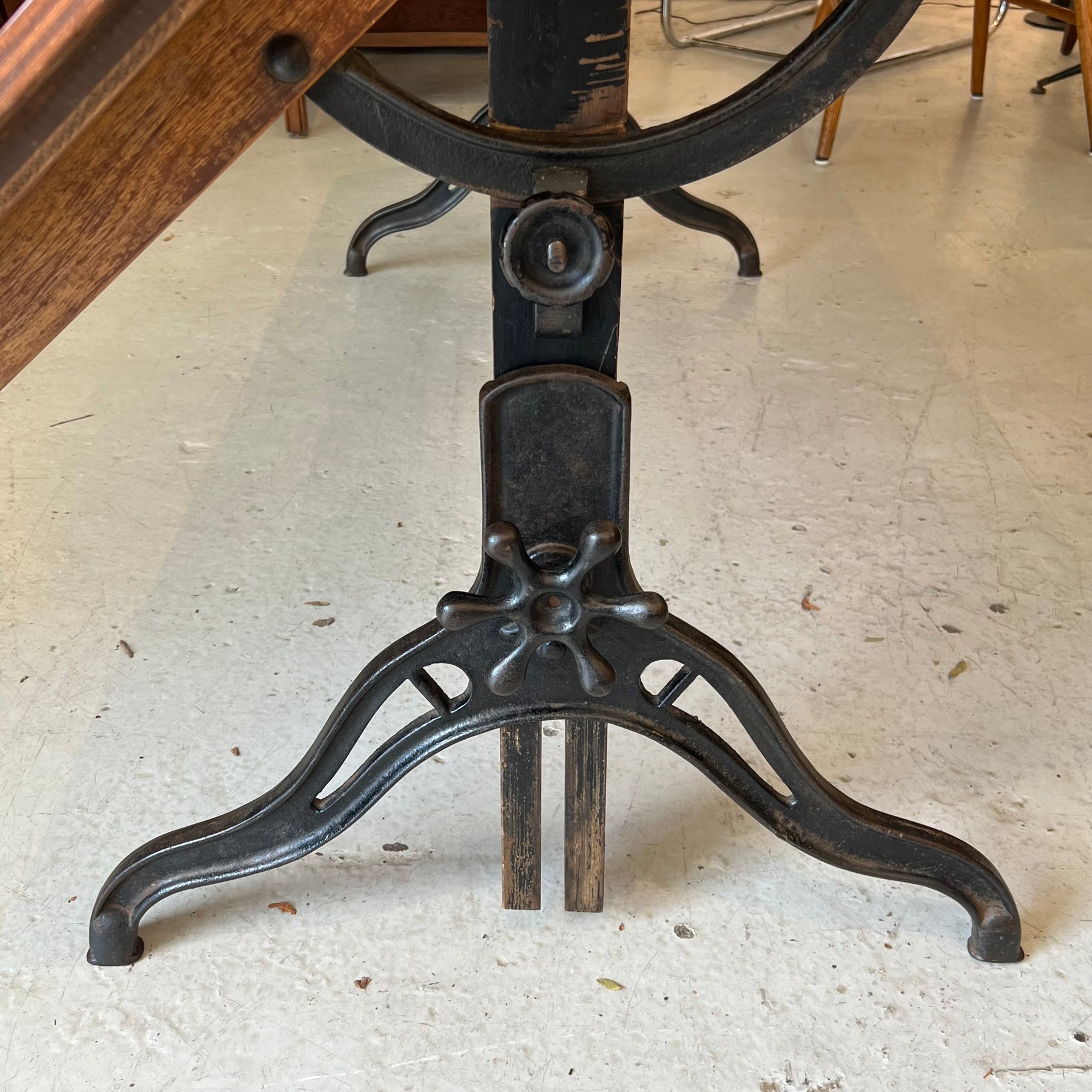 Gorgeous and sturdy antique drafting table with a cast iron base. The pine base and uprights are painted black but worn to an even, light patina throughout. Top is an older, clear pine ply with a nice amber finish. Aside from its original use, this drafting table could also be used as a dining or tall work table.