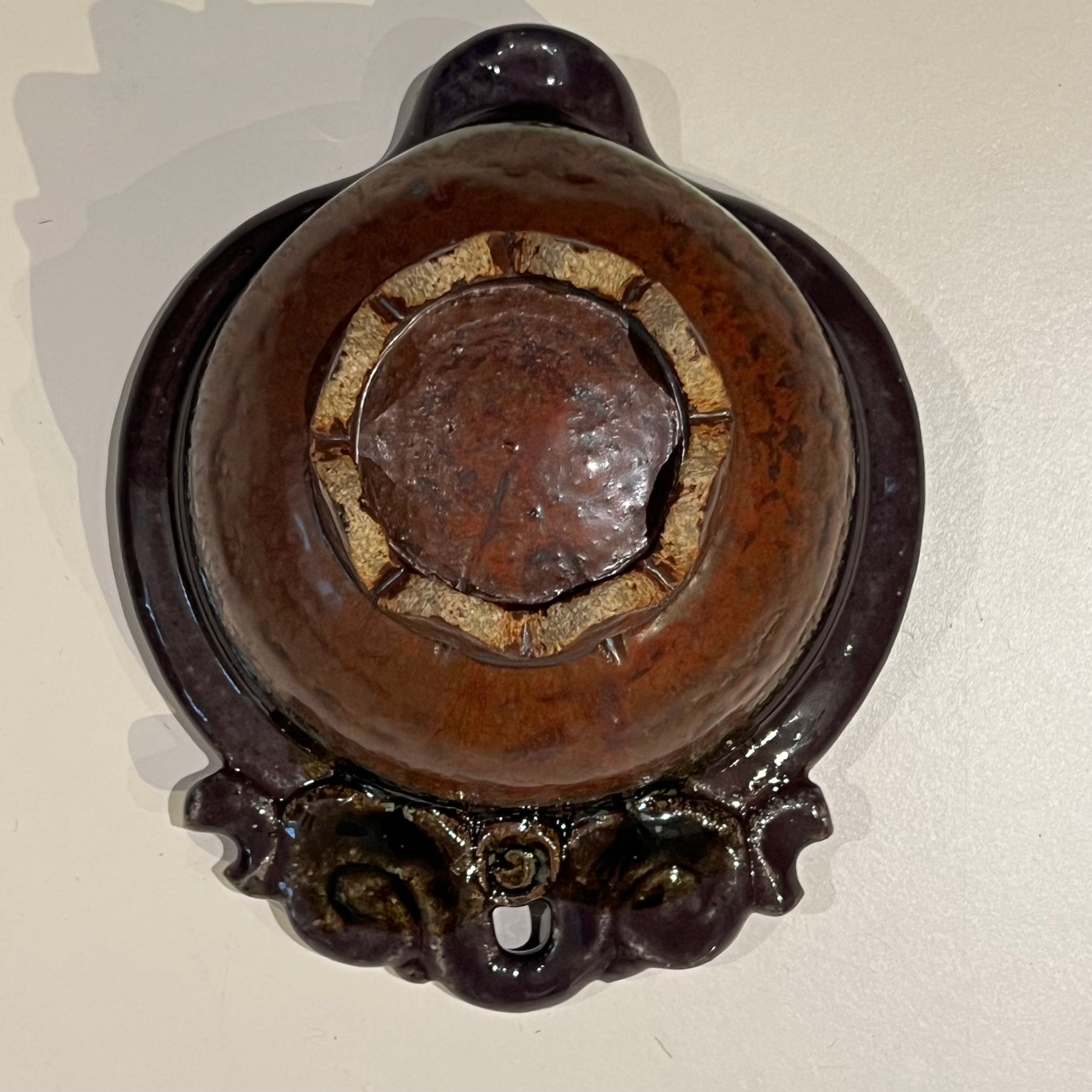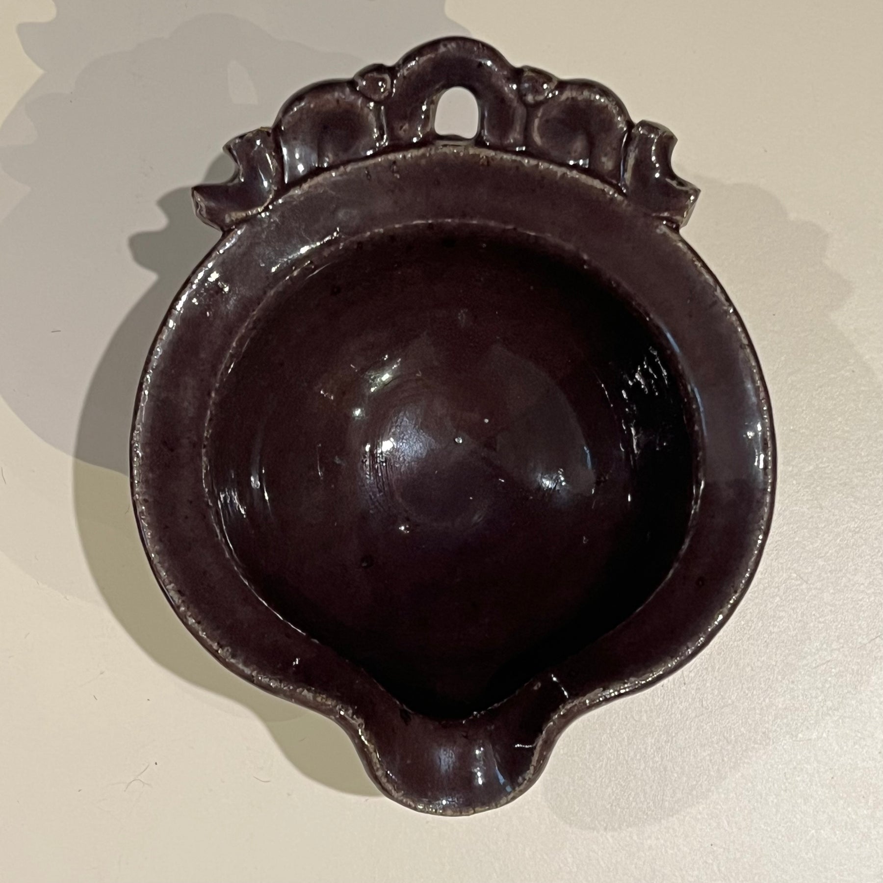 Vintage studio pottery ceramic creamer with a unique bowl-like design and toothy foot. Base has two small holes to insert a hanger if desired. Glaze is purple transitioning to reddish below.