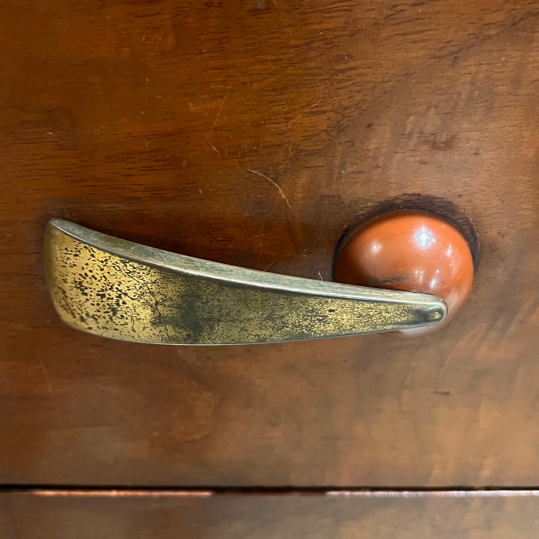 1940s-era art deco style walnut tallboy dresser by Huntley Furniture. Great design, solid construction. Finish is worn but has been cleaned up as best as can be; could be refinished, but has a nice patina in its current state and is priced accordingly. Bookmatched Burled veneer on fronts of drawers and fantastic brass and brown Bakelite pulls.