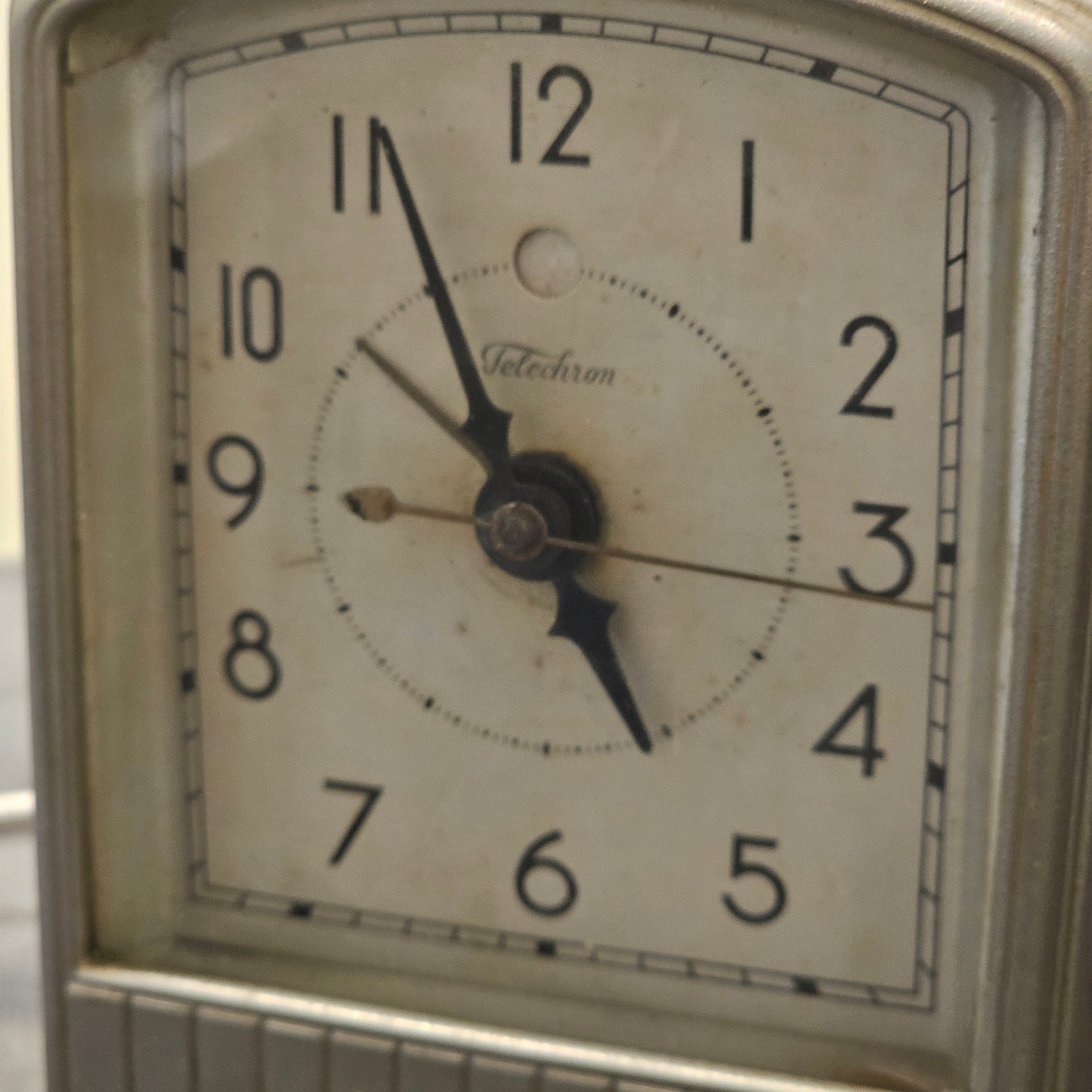 Vintage plug-in Telechron clock. Clock has been tested and appears to be non-functioning, but the internal light does work. There is also a small chip in the glass lens.